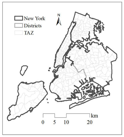 In recent years, the promotion of the open data policy in New York City has provided great convenience and opportunities for big data researchers [40]. The datasets are collected by the NYC Taxi and Limousine Commission and can be downloaded from the official website (https://www1.nyc.gov/site/tlc/about/tlc-trip-record-data.page, accessed on 1 December 2020). We select the High Volume For-Hire Vehicle trips records during 1 and 31 August 2019, as DT2 to analyze the taxi travel spatial structure in NYC. Each row DT2 represents a trip record, including pickup date-time, drop-off date-time, pickup location ID, and drop-off location ID (Table 2). In addition, we regard the taxi zones the NYC Taxi Administration provided as TAZs. There are 264 TAZs in the study, and Newark outside NYC is included in the following analysis (Figure 4). Since the records of DT2 are the OD trips directly, we did not further process the data.