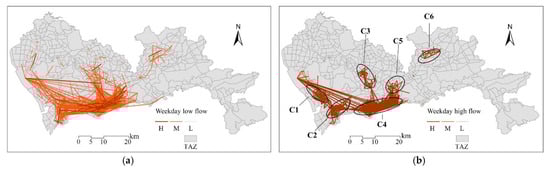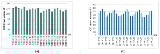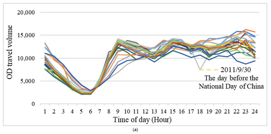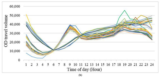 Figure 6 shows the hourly characteristics of the OD flow. The 20-day data of Shenzhen exhibit a relatively similar general hourly distribution pattern (Figure 6a): the travel activities gradually decrease from 0 to 6 in the early morning and increase rapidly from 6 to 9 during the morning peak hours. No obvious night peak pattern is observed. There is no clear difference between weekdays and weekends. Only one sudden drop in OD trips is observed at approximately 18:00 on 30 September, which is mainly caused by the night peak congestion before the 7-day holiday of National Day of China. Compared with Shenzhen, the hourly distribution of NYC exhibits two different types of hourly patterns (Figure 6b), which correspond to the weekday pattern and weekend pattern, respectively (Figure 7b).