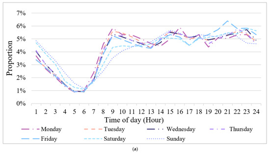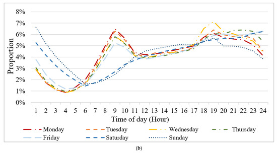 Friday nights (20:00–24:00) exhibit more travel demand than other weekday night periods and are similar to Saturday nights. In addition, the travel demand on Sunday exhibits a significant decrease after 21:00, but Sunday’s volume decreases the least. The potential reason is that people tend to arrange more activities on Friday nights since this night directly leads into the weekend, while Sunday nights precede a work day, and people prefer to rest to prepare themselves at home. These two results imply that Friday nights and Sunday nights have different patterns than other weekdays and weekend days, respectively. Separate policies may be needed for these two periods to avoid potential misleading decision making related to transportation services.