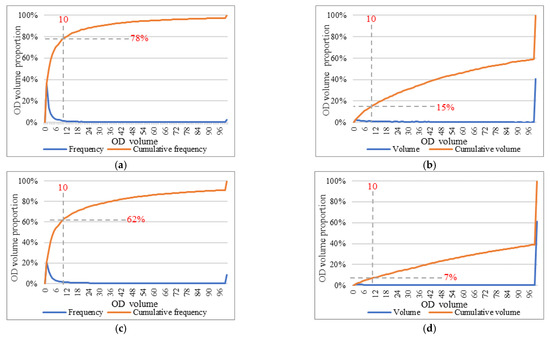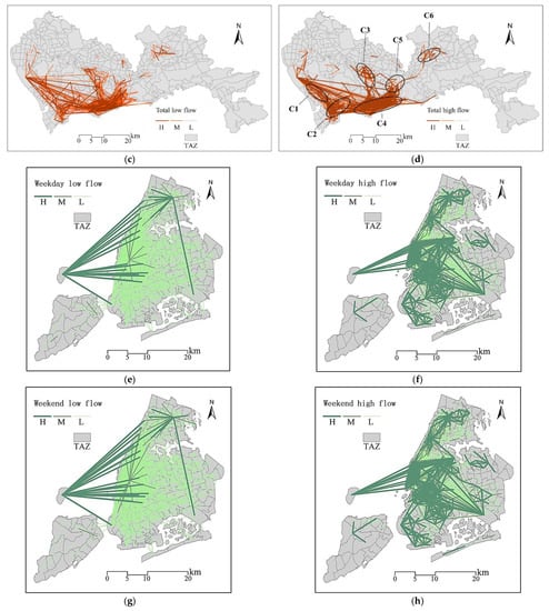 In Figure 8, taxi travel OD shows a heavy-tailed distribution, which means that a large number of ODs have a small volume. The number of ODs gradually decreases with increasing OD volume, as shown in Figure 7a,c. For example, there are 12,905 ODs between TAZs with fewer than 10 flows in Shenzhen, accounting for 78% of all TAZ ODs, but their cumulative volume only accounts for 15% of all flows, as shown in Figure 7b. In NYC, there are 11,296 ODs between zones with fewer than 10 flows in Shenzhen, accounting for 62% of all zone ODs, but their cumulative volume only accounts for 7% of all flows, as shown in Figure 7d. These ODs make limited contributions to the whole picture of the travel flows but will lead to obvious impacts on the description of travel patterns. Usually, a traffic volume threshold is applied in existing studies [41] to remove these ODs and reduce their negative impacts.