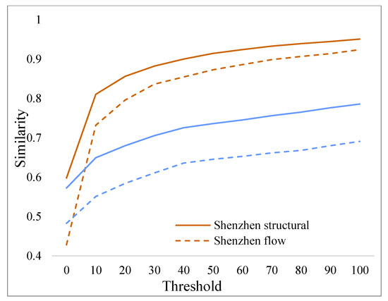When calculating the similarity of the OD matrix in this paper, we found that different thresholds have impacts on the similarity result. To reasonably select the threshold, we tested the similarity changes in the OD matrix based on the travel spatial structure and travel flow under different thresholds (Figure 9). The similarity increases with the threshold. When the threshold is greater than 10, the similarity growth rate slows down and tends to be stable in Shenzhen. In this study, we selected ODs with a flow volume greater than 10 to analyze the structural and flow similarities, and NYC’s threshold remains the same as Shenzhen’s.
