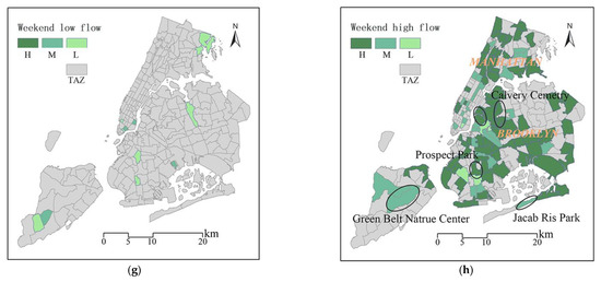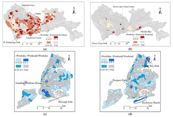 From the perspective of travel between geographic units for ODs with more than 10 trips, 65% of the travel flow between TAZs on weekdays is greater than that on weekends in Shenzhen. These TAZs are mainly concentrated in two places: IT Technology Park and its surrounding areas, the City Center and its surrounding areas, such as Huaqiang North Commercial Area, the Science Museum, and other areas. Another obvious feature is that the travel flow between the airport and these areas is also significantly increased (Figure 11c). These regions are mainly related to workplaces and business concerns. In contrast, the travel flow distribution that emerges on weekends is scattered and related to entertainment areas such as the Haiya Department Store, China Resources Vanguard, Forest Park, and Futian Station (Figure 11d). However, 27% of the travel flow between geographic units on weekdays is greater than that on weekends in NYC. These zones are mainly concentrated in Manhattan areas and interact between Manhattan and other areas. On weekends, cross-regional taxi travel activities increased significantly compared to weekdays.