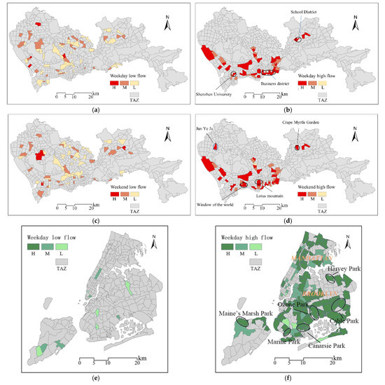 Based on the OD flow stability measurement method, we separately analyzed the changes in the stability of the geographic unit and between regions during weekday and weekend stability. (Figure 12 and Figure 13). Figure 12 shows the change in internal geographic unit travel stability based on traffic flow during weekdays and weekends. The overall high-traffic and high-stability areas are located in the Baoan Airport area, Futian Port, Huaqiang South, Technology Industrial Park, and other areas in Shenzhen. Office buildings and schools in the TAZs (e.g., Huaqiangbei, Dongmen, Old Street Commercial District, and Shenzhen University Area) on weekdays have a relatively stable and large traffic volume and a smaller volume during the weekend. In addition, TAZs with more diversified internal functions (such as Crape Myrtle Garden and the area near Junyeju) will have relatively higher stability on weekends (Figure 12f). Short-distance travel contributed to a stable traffic flow. In New York, Brooklyn and Manhattan are more stable on weekdays than the internal travel flow on weekends. Correspondingly, areas with more stable weekend trips generally have parks, and the regional infrastructure functions are relatively complete.