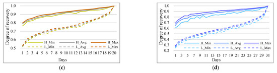 The degree of travel spatial structure and flow recovery. (a) Travel spatial structure in Shenzhen. (b) Travel spatial structure in NYC. (c) Travel spatial flow in Shenzhen. (d) Travel spatial flow in NYC.