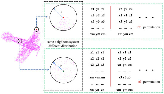 Let us look at the case of point clouds. Figure 3 illustrates the irregularity and disorder of a 3D point cloud. The left-hand side of Figure 3 represents the original point cloud of an object, for which we can identify a radius neighborhood system. The black dashed box in the middle indicates the irregularity of the point cloud, with different numbers of points and an uneven distribution within the same neighborhood. The green dashed box on the right-hand side reflects the disorder of the point cloud, with N being the number of point clouds, which can be seen to have N! permutations.