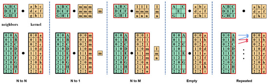 We can take an image as an example to analyze the different types of correspondence between the convolution range and the convolution kernel (Figure 5). In order to later expand the principle to point clouds, we can rearrange the image by column and by the pixel index position. The upper panel in the figure is the original image; the bottom panel is the reorganized image. In the left-hand panel of the figure, N-to-N represents the standard image convolution, where different positions have different parameter values. If all values are the same within the convolution kernel, this is equivalent to a single identical value, which can be seen as an N-to-1 correspondence. Figure 4 shows the correspondence types. Due to the irregularity, we need to use N-to-M correspondence for processing the point cloud. At this point, the irregularity of the point clouds is also solved.