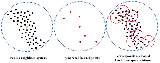 In light of this understanding of point clouds, we used the spatial positional correspondences as spatial data. Correspondences based on the Euclidean spatial location can be used to establish the correspondences of point clouds. We can assign the spatial coordinate points of the elements within the convolution kernel, which can be generated by different functions. The neighbors of the convolution kernel points are determined in the convolution range, which means that points in the convolution range will always have an unchanged correspondence. The points within the neighbors of a convolution kernel point will satisfy this correspondence. No matter how their order of permutation changes, this neighbor’s correspondence never changes, so the final convolution value remains constant. This correspondence based on the Euclidean spatial location can solve the problem of disorder in 3D point clouds and, in combination with the N-to-M correspondence strategy, can also solve the irregularity of 3D point clouds. Therefore, we can generalize the convolution operation and apply it to point clouds. Figure 6 describes the correspondences based on Euclidean spatial locations in 3D point clouds, represented by circles for convenience.