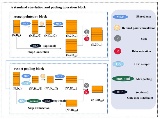 As an example of a convolution operation for point clouds based on the above analysis, we built a network using an encoder–decoder framework. We used the radius neighborhood. A previous study [30] has shown that the radius-based neighborhood system has a better representation in point clouds. We chose to generate the convolution kernel points according to the covariance matrix of the samples, where each layer had a different kernel according to the covariance matrix of the samples. Each layer used a ResNet architecture with grid sampling for pooling. The convolution and pooling modules both had a standard ResNet block. Figure 7 describes the convolution and pooling layers.