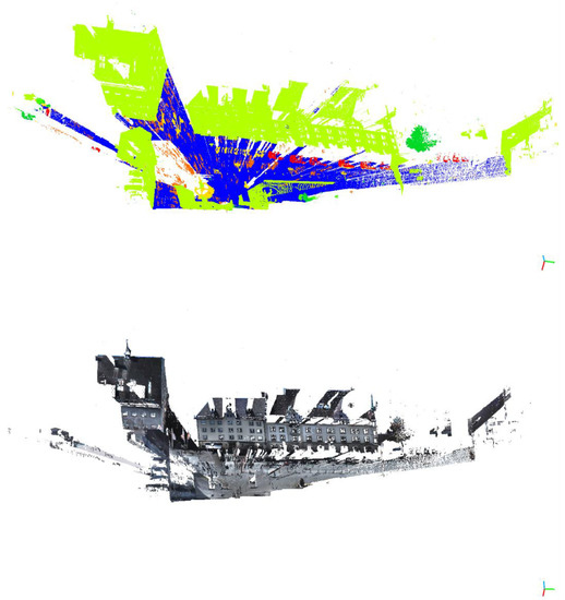 In the with-color experiment, each point was represented as a 9D vector (XYZ, RGB, and normalized spatial coordinates). In the without-color experiment, each point was represented as a 6D vector (XYZ and normalized spatial coordinates), and the other parameter were the same. The training dataset we used included the officially provided data; we used the reduced-8 data for testing. The input radius sample was 3 m. The first sample size was 0.06 m, and each subsequent layer was sampled at two times the size of the previous layer. The convolution kernel radius was the sample size of the current layer multiplied by the density parameter, which was a constant number that we set to 5. The batch size was 16 and the learning rate was 0.01. The momentum for batch normalization was 0.98. We generated the kernel points using the covariance matrix of the samples. Figure 11 shows the semantic segmentation results for the reduced-8 data with/without color. According to the visualization results, there was little difference between the color model and the non-color model. Our analysis found that the objects of the scene were buildings, streets, vehicles, etc. These objects can be identified geometrically even if they have no color information.