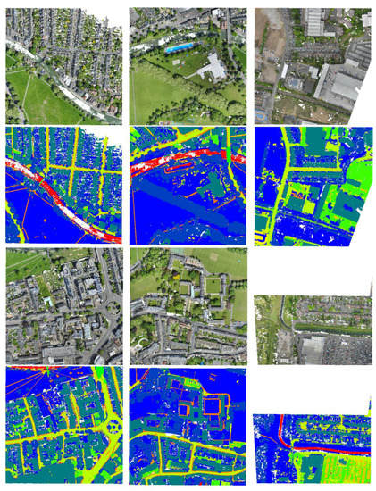 In the experiment, each point was represented as a 9D vector (XYZ, RGB, and normalized spatial coordinates). The training and testing datasets that we used were consistent with those of SensatUrban [3]. The input radius sample was 5 m. The first sample size was 0.1 m, and each subsequent layer was sampled at two times the size of the previous layer. The convolution kernel radius was the sample size of the current layer multiplied by the density parameter, which was a constant number that we set to 5. The batch size was 16 and the learning rate was 0.01. The momentum for batch normalization was 0.98. We generated the kernel points using the covariance matrix of the samples. Figure 13 shows the semantic segmentation results for SensatUrban.
