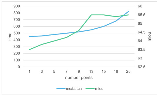 As shown in Figure 12, the mIOU reached its maximum when the number of kernel points was 13, and it did not continue to improve beyond this number. The time kept increasing as the number of points increased, as expected. This tells us that if we pursue speed, then we should reduce the number of kernels, while if we pursue accuracy, then we need to increase the number of kernel points, which we need to balance according to our needs. It should be noted that the optimal number of convolution kernel points is not fixed, depending on the different datasets, the sampling density, the framework’s structure, and the number of layers.