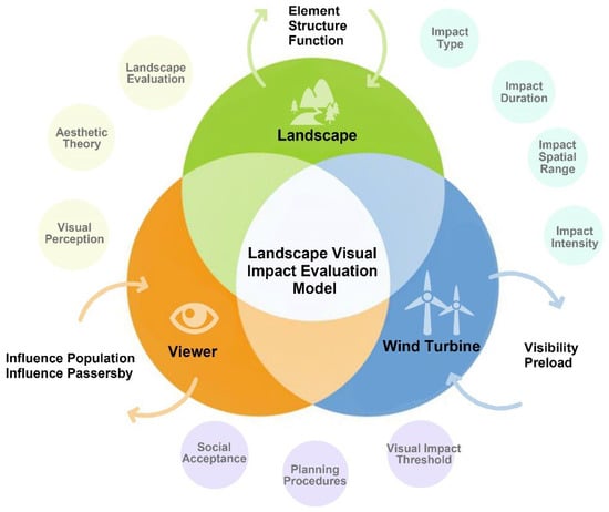 The theoretical framework of LVIE model is illustrated in Figure 1, which consists of three interacting bodies: landscape, wind turbines, and viewers. The process of LVIE can be understood as a process of judging whether the current situation meets the value standards put forward by the evaluator or not. The LVIE theoretical framework involves the connotation of the above three factors and the interdisciplinary theoretical knowledge among these factors as well. The potential factors and relevant theoretical knowledge will be discussed and integrated into the LVIE model to construct a multi-dimensional framework with mutually constrained indicators.
