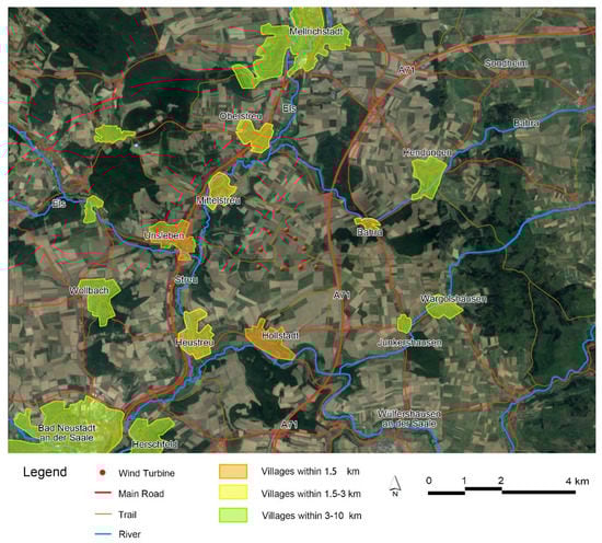 In addition to the measures for avoidance, compensation, and replacement listed in the project documents, additional requirements put forward by the state nature conservation and cultural assets authorities should be fulfilled. For the visual impact on the landscape with specific natural and cultural value, extra compensation should be paid to recover their value and function. For instance, specific subsidies to the tourism and recreational industry, agriculture and forestry are necessary as a type of compensation for the economic loss in these industries. The Bavarian State Office for the Preservation of Historic Monuments points out that the villages surrounding the planned area almost always have high quality and a valuable historic building substance [53]. Landmarks particularly sensitive to optical impairments are, from the perspective of conservation, the church of St. Michael in Heustreu, the church of St. James in Hollstadt and Unsleben Castle. Part of the compensation is suggested to be retained for subsequent distribution when necessary.