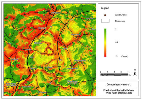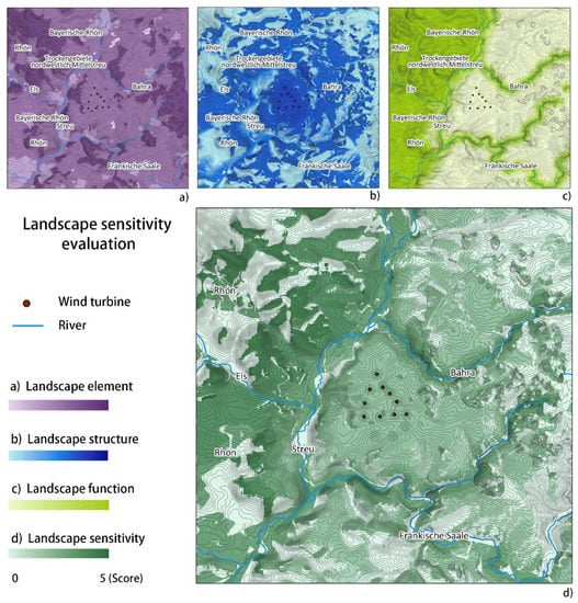 The evaluation result (Figure 4d) represents the landscape sensitivity degree with a research scope based on the buffer distance of 30 H (30 × 200 m). Each raster is assigned a score from 0 to 5. A score of 0 means low sensitivity, and a score of 5 refers to high sensitivity. According to the geographical information statistics based on the layer of “landscape sensitivity” in GIS, the average score of landscape sensitivity in the research area is 2.61 (a scale between 0 and 5). The sensitivity degree is closely connected to the naturalness of the landscape [47]. For instance, the ecological protection areas (e.g., drylands of Mittelstreu and Bavarian Rhön) located west of Streu River, and areas near the water areas (e.g., Eis, Streu, Bahra, and Fränkische Saale) are highly sensitive. While the agricultural land near the wind farm site has a medium degree of sensitivity. Other resources, such as cultural heritage, recreational sites, and forest are also affected by WTs, as illustrated in Figure 4d.