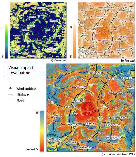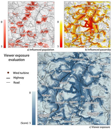 The viewer exposure evaluation, based on the influenced proportion of the population (Figure 6a) and passersby (Figure 6b), helps to quantify the visual impact on viewers. Typically, viewers’ relative position and motion status affect their perception of visual impact. For instance, how often and how long people are faced with turbines, and how many proportions of the population are impacted by WTs at the locality, make quantitative visual impact evaluation extremely complicated. Though including such high subjective indicators, it is still practicable to conduct the viewer response through comparative analysis. Figure 6c illustrates the different degrees of viewer exposure in each raster unit. The average is 2.39, which represents a comparatively low exposure degree. The highly exposed areas concentrate on transportation lines across the wind farm, especially the highway A71 and railway, as well as the dwelling close to the wind farm, such as Unsleben, Mittelstreu, Oberstreu, and Bahra.