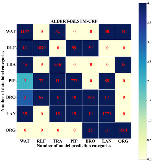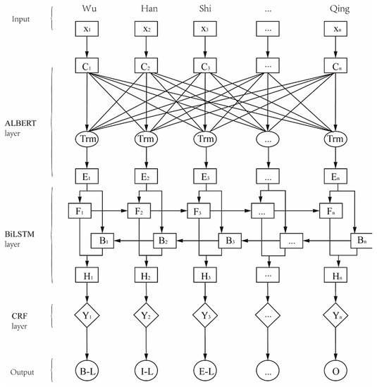 Figure 3, and the whole model is divided into five parts: the input layer, ALBERT layer, BiLSTM layer, CRF layer, and output layer.