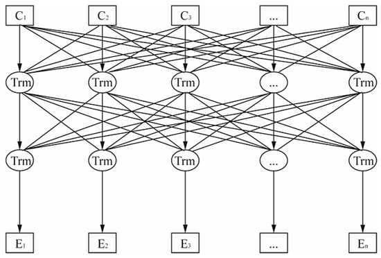 In the figure, C = (C1, C2, …, Cn) indicates that each character in the sequence is trained by a multilayer bidirectional transformer (Trm) encoder to finally obtain the feature vector of the text, denoted as E = (E1, E2, …, En). After the input text is first processed by word embedding, the positional information encoding (positional encoding) of each word in that sentence is added. The model learns more text features by combining multiple self-attentive layers to form multi-head attention. The output of the multi-head attention-based layer is passed through the Add&Nom layer, where “Add” means adding the input and output of the multi-head attention layer, and “Norm” means normalization. The result, after passing through the Add&Nom layer, is passed to the feed-forward neural layer (Feed Forward) and outputted by the Add&Norm layer.