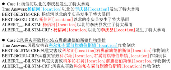 We used the GloVe word embeddings (the number of tokens is 54,238, and the dictionary size is 399 KB) that were trained on 2 billion texts, with 11 billion tokens and 1.8 million vocabulary items collected from Baidu Encyclopedia, Weibo, WeChat, etc. These word embeddings, specifically trained on a large social-media-messages corpus, include many vernacular words and unregistered words used by people in social media messages. Previous geoparsing and NER models typically use word embeddings trained on well-formatted text, such as news articles, and many vernacular words are not covered by those embeddings. When that happens, an embedding for a generic unknown token is usually used to represent this vernacular word and, as a result, the actual semantics of the word are lost. Second, compared with the basic BiLSTM–CRF model, our presented model adds an ALBERT layer to capture the dynamic and contextualized semantics of words.