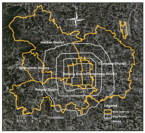Housing policies and design specifications can pose a significant impact on the main urban area [33,34,35], so the study selected six main urban districts of Beijing as the study area, which are delineated according to the ring roads and street boundaries (Figure 2). Among the selected districts, Xicheng District and Dongcheng District are located within the 2 ring road and are the political-administrative districts of Beijing. Chaoyang District and Haidian District are mainly located within the 2–5 ring roads and carry Beijing’s financial and educational functions, respectively. Fengtai District and Shijingshan District are located in the western and southern suburbs of the city, respectively, carrying a large residential population. It should be emphasized that within the second ring road is the Historic Landscape Preservation Area [36], and there are special community types such as courtyards and single-family dormitories [37] that may affect the regional measurement results, so the area within the second ring road is excluded.