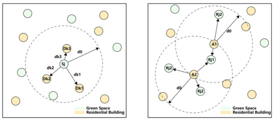 To accurately measure the service efficiency, the Regional Statistic method with low accuracy was excluded. In the Gravity Model method, the Gaussian-based 2-Step Floating Catchment Area (hereafter 2SFCA) method, which is widely applied in urban-scale green space studies, was selected. Since residents’ movement within the community is mainly via walking and the measurement results of spatial and temporal distance costs are similar, the Shortest Time Distance method was selected. The operation processes of the two methods were as follows: (1) the 2SFCA method: the method was proposed by Radke [41], and then Luo assigned a relative distance-based attenuation weight to it [42]. The mechanism of the method is shown in Figure 3, and the operation steps were as follows:
