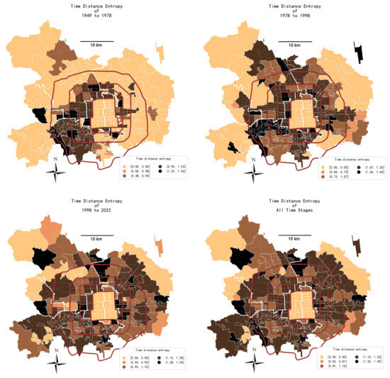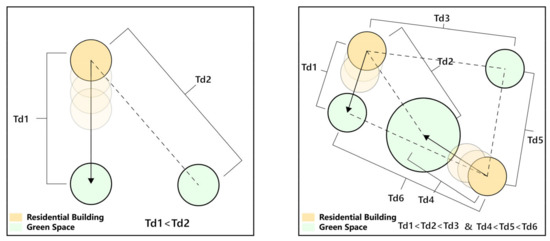 The value of can reflect the orderliness degree of the shortest time distance distribution [46]; the higher the value, the smaller the correlation between the location of green spaces and residential buildings, and vice versa. The results of the Time Distance Entropy method can initially identify the ‘centralized’ and ‘courtyard’ type distributions.