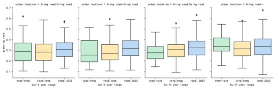 Before the measurement, the Greening rates of the selected cases were conducted and classified by the built year ranges and urban ring road ranges to assess the impact of the area proportion indicator on the study, and the results are shown in Table 1 and Figure 5.