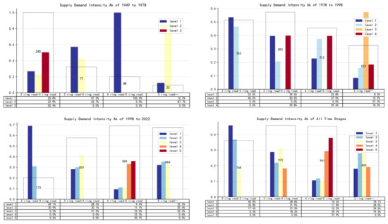(1) During 1949–1978, level 1 and level 2 communities accounted for about 20.0% of the total number of the 2–5 ring road. Level 3 communities were evenly distributed in the other ranges (about 20.0%) except for a relatively small proportion in the 3–4 ring road (8.4%). All level 4 communities were evenly distributed in the ranges of the 2–4 ring road, accounting for 23.3% and 26.0%, respectively. Level 5 communities presented an increasing trend with the outward expansion of the ring roads (accounting for 5.2%, 25.6%, 30.0%, and 64.3%, respectively).