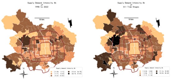 where is the scale of green space supply, measured by metric area, and is the search radius, measured in 150 m based on residents’ walking preference for community green space [43]. The demand point k in this study is the residential buildings in the communities where the green space is connected, and is the number of residents in each residential building. is the walking distance between the supply point and the demand point. is the Gaussian coefficient. is the sum of the supply intensity for each supply point within the search radius , with as the attenuation weight. The service efficiency level of community green space is reflected by the mean value of for the community. In this study, the measurement of 2SFCA was conducted through the geopandas module of Python to improve the efficiency of the calculation.