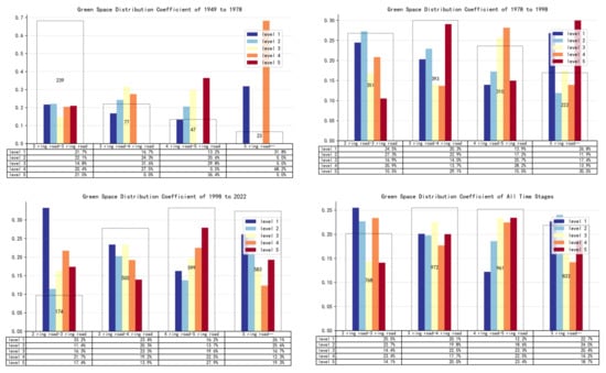 The temporal dimension model is formed by classification according to the built-year ranges of the case communities. After the founding of the People’s Republic of China (PRC), the development of communities could be divided into the Danwei Compound phase from 1949 to 1978 [47], the Reformed Housing phase from 1978 to 1998, and the Commodity Housing phase from 1998 to the present [48]; therefore, the case communities were classified according to the three phases in the temporal dimension. The spatial dimension model is formed by classification according to the ring roads of Beijing; according to the spatial structure of Beijing, the case communities are classified into four categories: the 2–3 ring road, the 3–4 ring road, the 4–5 ring road, and those outside of the 5-ring road [49]. To visualize the spatial-temporal patterns of the measurement indicators, the measurement values of each indicator were divided by natural breaks into five levels (level 1–level 5) from small to large, then the case communities were divided based on the temporal dimension model, and finally, the percentage of the green spaces in different levels of communities of the spatial dimension model was calculated, which was displayed in a classification bar chart; meanwhile, the numbers of communities in each spatial range were also plotted as a reference.