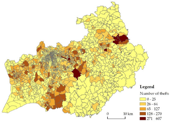 where Xs are the independent variables that may influence the distribution of theft, are the estimation parameters of the related variable; are the spatial lag value of the related variables; is the residual error, indicating other unmeasurable influence factors. The parameters could be estimated based on the maximum likelihood estimation method.