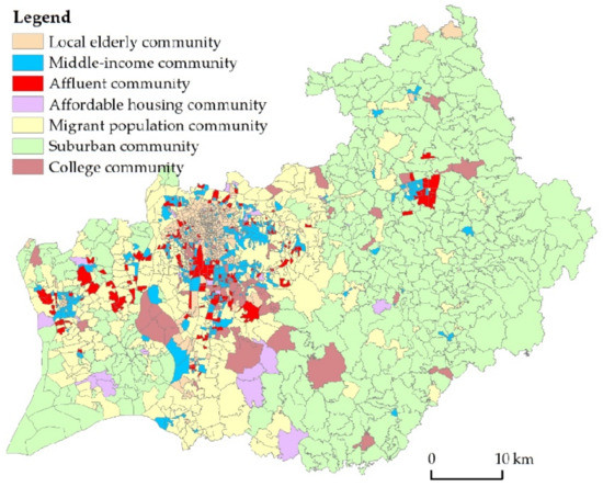 Moreover, individuals with similar social and economic attributes may inhabit the same community. That is, individual attributes have a strong correlation with his/her place of residence [20,21]. Therefore, it is possible to classify the population as per their places of residence. For example, Zhou et al. classified Guangzhou into several groups based on the census, including middle-income community, low-income community, urban population community, intellectual community, etc. [22]. Hirschfield et al. used different types of neighborhoods identified by the census to investigate their impact on crime [20]. The mobility or the actual presence of the residents from different social areas can have diverse impacts on theft. In other words, the relationship between ambient populations of different social groups and theft is still unknown.