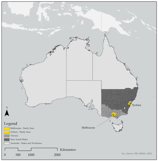 This study includes Australia’s two largest cities, Sydney and Melbourne (see Figure 4). These case studies have been selected because they were the only capital cities to suffer from major outbreaks of the Delta Variant of COVID-19 under Australia’s strict policy of international and state border closures and quarantine. Both cities are located on Australia’s East coast and serve as this country’s major economic engines and international gateways. Together, they represent 40% of the total population and contribute approximately AUD 1.2 trillion to the GDP (EUR 780 billion) [30].