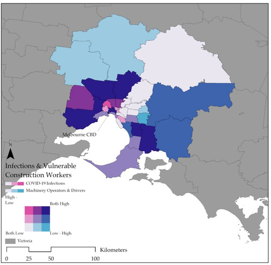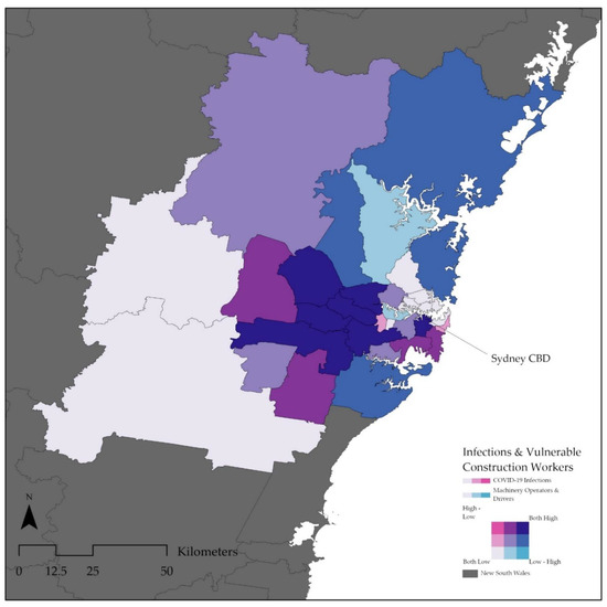 Our analysis of the data showed that, in Sydney, infections were only weakly correlated with Construction Workers in general (ρ = 0.4). However, further analysis showed the relationship to be variable based on SES factors. Of the various types of construction workers, Machinery Operators, Drivers and Laborers (ρ = 0.6) were most at risk. Technicians and Clerical and Administrative Staff were moderately at risk (ρ = 0.5). Professionals and Managers, as expected, were very weakly correlated with infections (ρ = 0.07 and ρ = 0.2, respectively). In Figure 5, the relationship between the most exposed construction workers, Machinery Operators and Drivers, and infections across Sydney is illustrated using bivariate mapping. As can be seen, the incidence of the Delta Variant of COVID-19 is strikingly similar to the distribution of workers known to be exempt from public health orders who travel from site to site in the conduct of their trade.