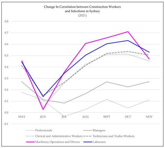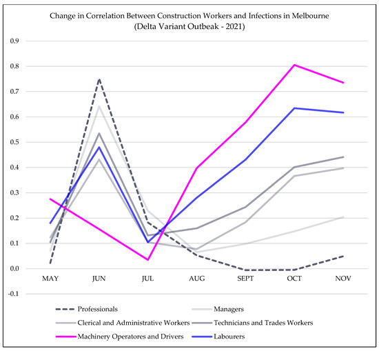 Changes in the correlation between construction workers and the spread of COVID-19 were also distinctly different in Melbourne compared to Sydney. In the first two months, the risk profile of almost all classes of construction workers spiked, with Professionals and Managers most exposed.