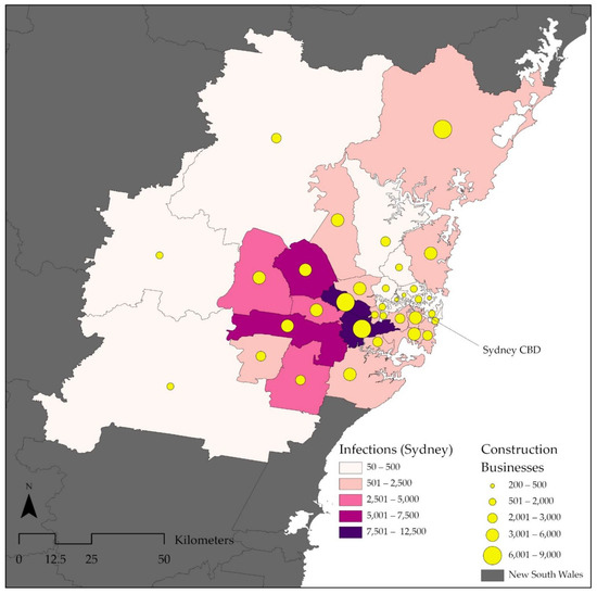 Choropleth map showing COVID-19 cases overlayed by graded symbology showing construction business counts across Sydney.