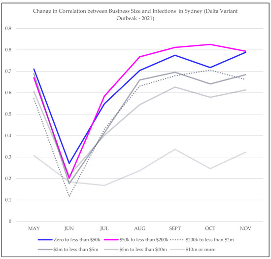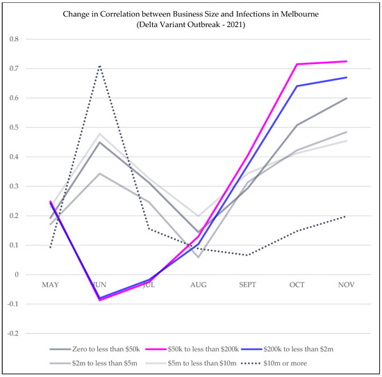 Moreover, the correlation between business and the Delta Variant also varied according to income. Surprisingly however, very small construction businesses with incomes between AUD 0 and AUD 50,000 were only moderately at risk (ρ = 0.5), while small business with incomes between AUD $50,000 and AUD $200,000 (ρ = 0.7) and AUD $200,000 and AUD $2,000,000 (ρ = 0.6) bore the highest risk of infection. Medium-sized companies earning AUD $2,000,000 to AUD $5,000,000 (ρ = 0.4) and AUD $5,000,000 to AUD $10,000,000 (ρ = 0.4) were weakly correlated with disease, and, as expected, large companies earning over AUD $10,000,000 (ρ = 0.1) were very weakly related to the spread of infections in LGAs.