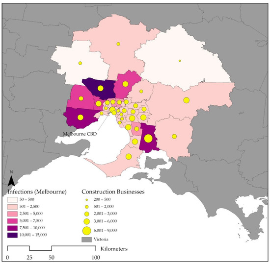 Choropleth map showing COVID-19 cases overlayed by graded symbology showing construction business counts across Melbourne.