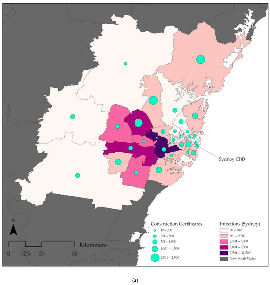 Choropleth maps showing COVID-19 cases overlayed by graded symbology showing the number of approved construction sites across (a) Sydney and (b) Melbourne.