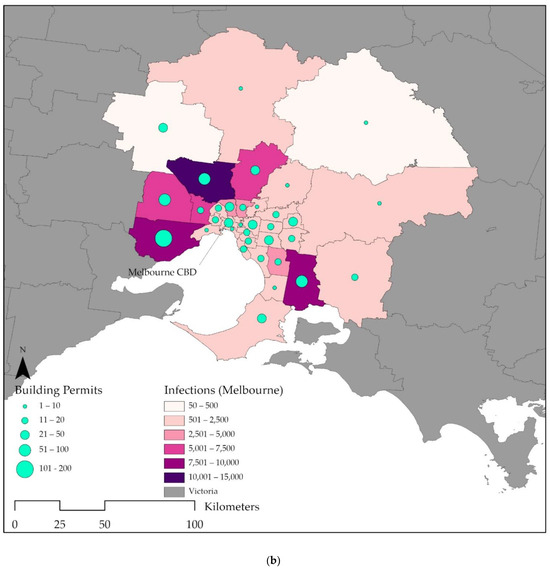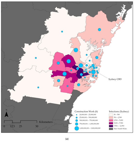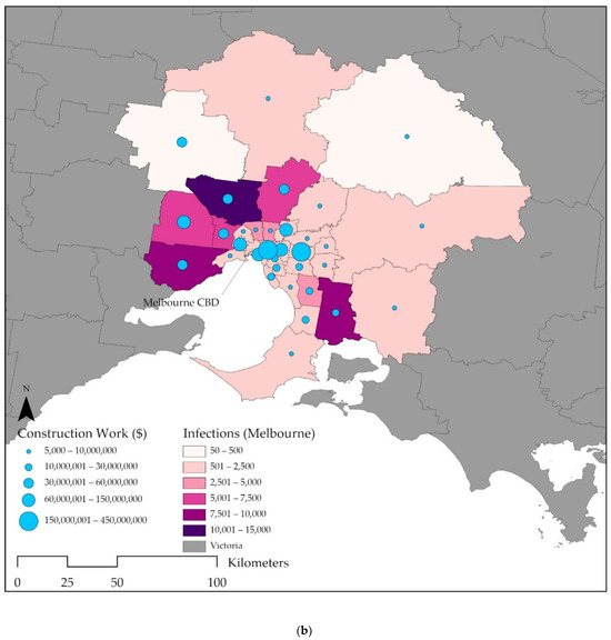 Choropleth maps showing COVID-19 cases overlayed by graded symbology showing the value of construction work across (a) Sydney and (b) Melbourne.