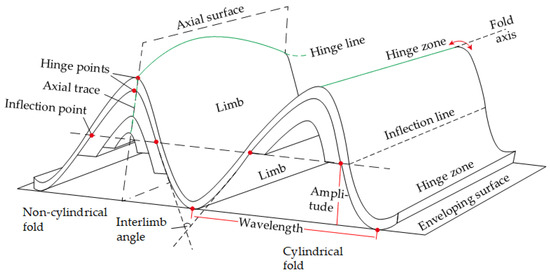 In general, fold structures not affected by strong denudation are wavy structures in shape [34] whose spatial morphology can be described by fold elements, such as limbs, hinges, and axial surfaces [42,43,44]. The limb refers to the rock strata on both sides of the core, the hinge is the connecting line of the maximum bending point on each cross-section of the fold, and the axial surface refers to the surfaces formed by connecting the hinge lines on each adjacent fold stratum (Figure 1).