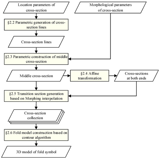 This study aims to develop a novel parametric modeling method for the 3D symbols of fold structures using cross-sections generated by fold parameters and a contour comparison algorithm. The cross-section generation method based on parameters and the Bezier curve effectively supports the parametric modeling of cross-sections of various fold structures. Transition section generation based on morphing satisfies the smooth requirement of the symbol model. The symbol-modeling method can control the model accuracy and data size by setting an appropriate number and quality of cross-sections, which may be measured or generated by fold parameters.