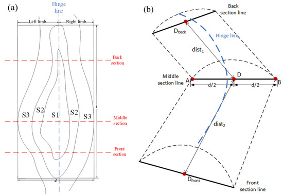 Furthermore, to break through the excessive dependence on geological survey data, this study applies the premise of extracting section location parameters based on geological maps (Figure 3a) and mainly determines the location of cross-sections according to the modeling parameters input by users (Figure 3b). The specific steps are as follows: (1) take the center point D of the middle section, according to the position parameters as the midpoint, and extend, perpendicularly, to the average hinge line strike (hinge line in Figure 3a) to obtain the positions of inflection points A and B of the middle section at d/2; and (2) calculate the affine transformation coefficient and generate the positions of the section lines at both ends, according to the distances (dist1 and dist2) from the front and back sections to the middle section, the occurrence of the hinge line (including front and back strikes of hinge lines μ1 and μ2 and front and back dip angles of hinge lines δ1 and δ2) and dip angle of the axial surface of the front and back sections γ1 and γ2.