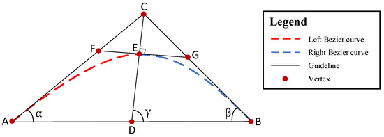 The generation of the reference stratum boundary mainly includes the following steps: (1) calculate the intersection point C of the tangent lines at the inflection points, according to the inflection points (A and B) of the middle section, and the dip angle of the two limbs (α and β) mentioned in the section morphological parameters; (2) find the intersection point D between the angle bisector of angles ACB and AB, and CD is the axial surface line of the middle section; (3) cut point E proportionally on CD as the hinge point, based on the morphological parameter curve; (4) extend the vertical line of CD through point E and intersect AC and BC to points F and G, respectively; and (5) take points A and E and points E and B as the endpoints, and F and G as the Bezier control points of the left and right curve segments, respectively, and then conduct segmented Bezier interpolation to obtain the reference stratum boundary (Figure 5).