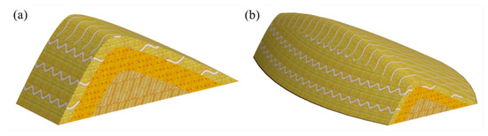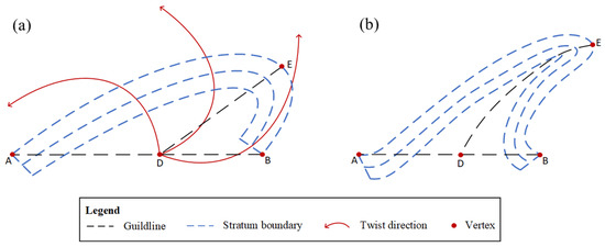 The two limbs of the overturned fold inclined in the same direction, and one of the limbs was overturned. The stratum boundary generation method in Section 2.3.1 can be used to construct the stratum boundaries by treating the dip angle at the overturned limb as an obtuse angle (Figure 8a). However, owing to the compression and deformation between strata, most of the strata of the overturned folds will be distorted to varying degrees [49]. Therefore, when constructing the middle cross-section, the rotation angle of the section point set around vertex D can be calculated according to Formula (1). Distortion and deformation processing are then carried out to realize an approximate simulation of the overturned fold morphology.