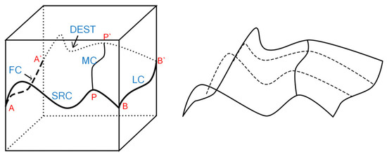 Morphing is an interpolation technique that smoothly transitions an initial object into a target object. This technology has been widely used in animation production, virtual reality, image compression, and image reconstruction [50,51,52]. Three types of boundaries are necessary for morphing interpolation (Figure 10): (1) the starting boundary with direction (SRC); (2) the target boundary (DEST) with a direction that must be consistent with that of SRC; and (3) the first and last constraint boundaries with directions (FC and LC) [53].