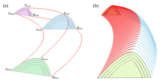 Among the four constraint boundaries of the morphing interpolation method, the starting and ending stratum boundaries, SRC and DEST, can be obtained from the stratum boundary on the corresponding limb [46]. To make the section transition smoother, the constrained stratum boundaries, FC and LC, must be obtained by interpolation according to the corresponding characteristic points of each section. By connecting the points generated by the Lagrange interpolation results of A, E, and B (i.e., left inflection point, hinge point, and right inflection point, respectively), three smooth curves (AfrontAmidAback, EfrontEmidEback, and BfrontBmidBback) of each stratum surface can be obtained (Figure 11a).