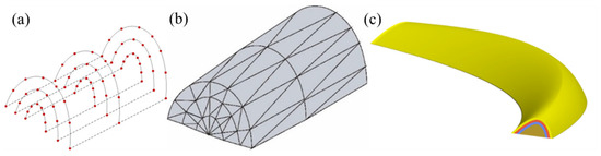 After the construction of all of the transition sections is completed, the boundary representation (Brep) surface model of the fold symbol can be built based on the contour comparison algorithm [55]. The difficulty of the contour algorithm lies in the treatment of branching, correspondence, meshing, and smoothing problems [56]. For the method used in this study, because the point sets between adjacent sections are all in one-to-one mode, the branching problem and corresponding problem are not observed. The smoothing problem can also be solved by generating transition sections.