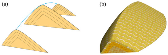 The cross-sections, including the front, middle, and back, were obtained. Theoretically, these cross-sections can be stitched directly to complete the rough construction of the entire fold model. However, the spatial morphology of the hinge line is difficult to express using this method, which affects the accuracy and aesthetics of the model results to a large extent. Therefore, many transition sections need to be generated through morphing interpolation according to these cross-sections to realize the fine modeling of the fold symbol.
