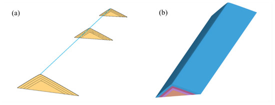 This study’s 3D parametric modeling method of fold symbol construction can realize symbol model construction when the geological data are insufficient. Although the symbol has an abstract requirement for the model structure, less dependence on geological data also means that the model results will be simplified in terms of morphology and large discrepancies with the actual structure may occur. In the case of complex sections, if the measured cross-sections are available, they can be used to replace the cross-sections generated by the parameters, so that more accurate modeling of the fold symbol can be carried out [23,24,25]. For example, by selecting the cross-section (Figure 20a) of the Danaobo mountain syncline as the middle section, a more detailed symbol model of the Danaobo mountain syncline can be built (Figure 20b). This experiment shows that the symbol model of the fold structure based on the measured cross-section can restore the actual morphology of the current fold structure. This method also has some shortcomings, such as relying on geological section data and being unable to directly reflect the original structural morphology before being subjected to external forces. In specific applications, the appropriate method for the cross-section can be selected according to the geological data and requirements to achieve the best data utilization and model expression effect.