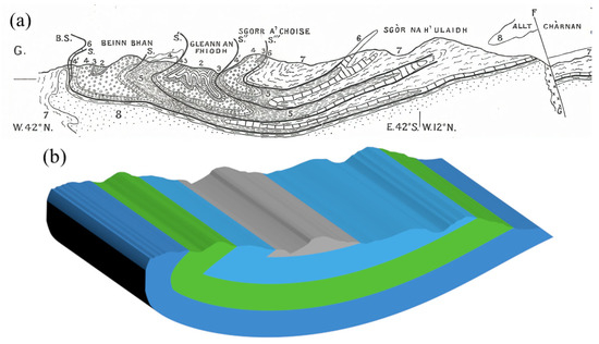- Bailey, E.B. Recumbent Folds in the Schists of the Scottish Highlands. Q. J. Geol. Soc. 1910, 66, 586–620. [Google Scholar] [CrossRef]